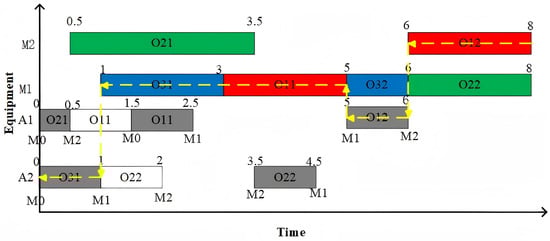 Finally, the decoded scheduling diagram shown in Figure 2 is obtained. The color coding in the figure is explained as follows: red, green, and blue indicate the processing times of Jobs , , and , respectively. White and gray blocks represent the AGV’s unloaded and loaded travel times.
