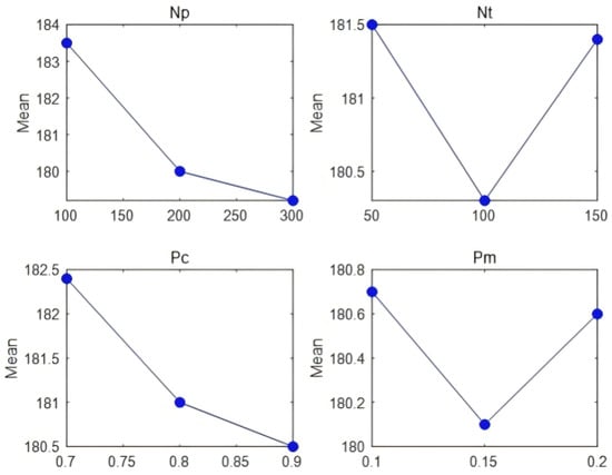 Since the parameter settings have a significant impact on the algorithm’s running time and computational accuracy, to enable the algorithm to run in a relatively optimal state, this paper selects some parameters through orthogonal experiments. These parameters include: population size , interval iteration number , crossover probability , and mutation probability .