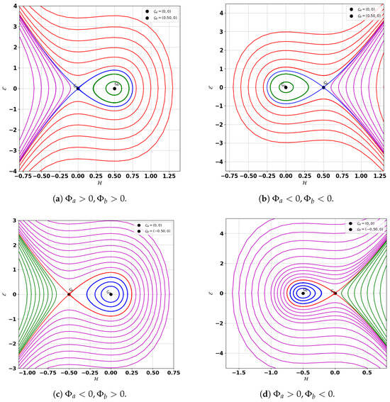 - For , the equilibrium points remain and , but in this case, is a saddle (unstable), and is a center (stable) [31]. This result is illustrated in Figure 7b.
