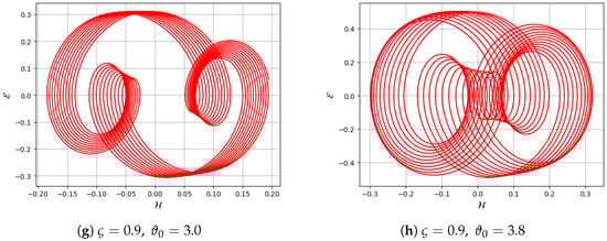 This study examines the system’s response to varying perturbation intensities and frequencies by analyzing quasi-periodic and chaotic dynamics while keeping the primary parameters, and , fixed. Figure 8a–f illustrates the system’s state with trajectory variations based on frequency and intensity. The investigation employs 2D phase-space trajectories and time series plots to reveal the system’s periodic and quasi-periodic behavior. Quasi-periodic behavior is detected through 2D phase portrait analysis using parameters and with varying and in Equation (89).