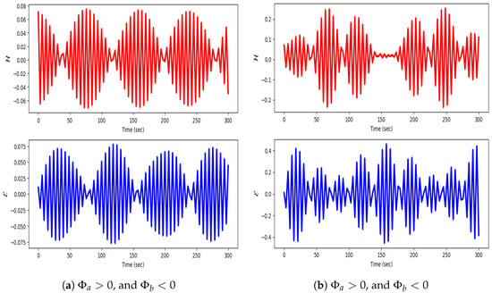 Multistability refers to the coexistence of multiple solutions within a dynamical system under specific physical parameters and initial conditions [32,33]. This section examines the perturbed system (86) with an external forcing term to explore its multistable behavior. Phase graphs and corresponding time series plots are utilized to analyze these dynamics in system (89). Figure 14a depicts quasi-periodic behavior for initial conditions (blue) and periodic behavior for (red) with and . Figure 14b shows quasi-periodic behavior for (blue) and periodic behavior for (red) under the same parameters. Figure 14c presents quasi-periodic behavior for (blue) and periodic behavior for (red). Figure 14d illustrates quasi-periodic behavior for (blue) and periodic behavior for (red). Overall, the observations confirm that the system exhibits quasi-periodic behavior.