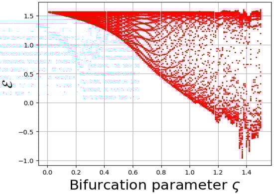 Detection of quasi-periodic behavior in the system using bifurcation diagram with parameters , in Equation (89).