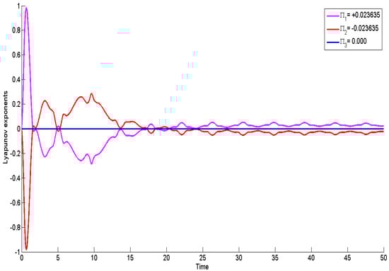 In this subsection, the chaotic nature of the proposed system is examined using Lyapunov exponent analysis, as illustrated in Figure 12 using the values of and , with , . The Lyapunov exponents serve as key indicators of chaos, quantifying the average rates at which nearby trajectories in the phase space diverge or converge over time.