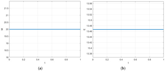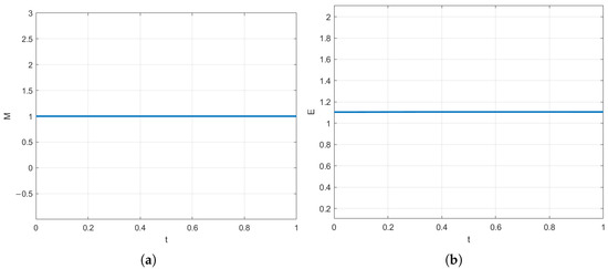 Figure 1 presents the results of numerical simulations of the Hirota equation using the conservative CN scheme, focusing on mass and energy conservation at . The mass conservation curve in the left plot clearly shows that the mass M remains constant at 1 throughout the entire time range , indicating that the numerical method is able to precisely maintain mass conservation. The energy curves also remain flat.