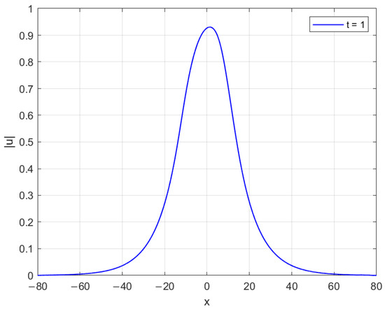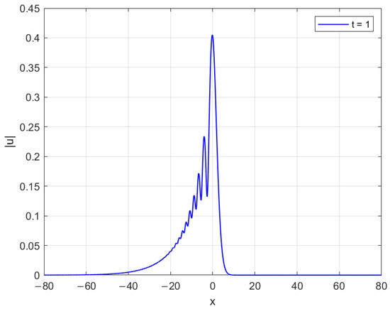 Figure 2 illustrates the numerical behavior of the solution obtained. In panel (a), the soliton profile at time is displayed, showing the expected localized and symmetric wave structure. Panel (b) demonstrate the dynamical evolution of over the time interval with and . For longer-time simulations, the computational domain would need to be enlarged to avoid distortions caused by boundary reflections.