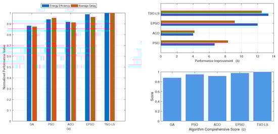 A comparative analysis of the TSO-LS, GA, PSO, EPSO, and ACO algorithms is presented in Figure 2 and Table 3, which illustrates their respective performance in terms of energy efficiency, latency, and overall comprehensive performance.The results show that TSO-LS improves energy efficiency by 13.3% over the GA algorithm, and a 12.5% reduction in average latency. Under different experimental conditions, the TSO-LS strategy shortens the average latency to 10.5 ms. Compared with the GA algorithm, the overall algorithm score of TSO-LS increased from 0.879 to 1.0. TSO-LS demonstrates a clear advantage in key evaluation metrics such as energy efficiency and average delay.
