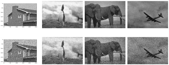 Set of selected noisy images used for denoising experiments. First and second rows correspond to images with noise levels of and , respectively.