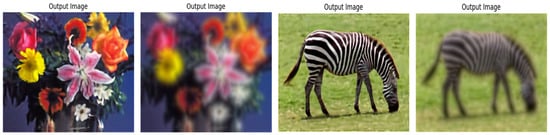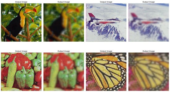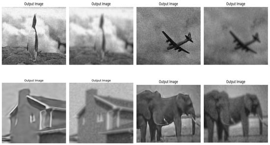 In the results of Figure 15, the first and third columns correspond to the outputs generated by DIP-MC, while the second and fourth columns represent the results obtained using DIP-TV. This side-by-side comparison highlights the differences in performance between the two methods, particularly in terms of restoring sharp edges and reducing artifacts caused by motion blur. The visual results demonstrate that DIP-MC achieved superior restoration quality, as evidenced by its ability to preserve finer details and enhance structural clarity compared to DIP-TV. This is consistent with the measurable enhancements noted in Table 5, where DIP-MC consistently surpasses DIP-TV regarding both PSNR and SSIM metrics.