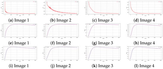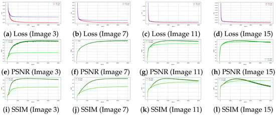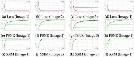 Figure 12 shows the training behavior of the proposed DIP-MC method on a dataset of color images. The first row displays the loss curves over epochs, indicating stable convergence for all four test images. The second row presents the PSNR progression, showing that reconstruction quality steadily improves during training. The third row depicts the SSIM evolution, reflecting continuous enhancement in structural similarity to the reference images. Collectively, these plots demonstrate that DIP-MC effectively improves both quantitative metrics and perceptual quality for color images.