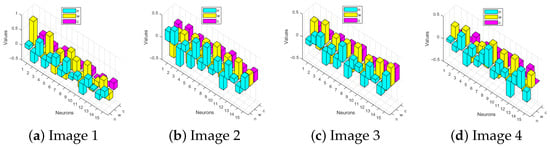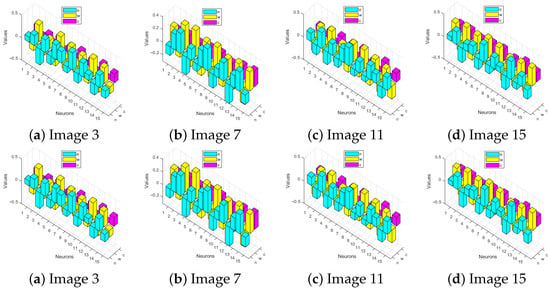 Figure 10 provides a comparative neuron-wise parameter analysis between DIP-MC and DIP-TV methods for color image reconstruction. The first row presents the neurons with the strongest contributions identified by the DIP-MC approach, whereas the second row illustrates the corresponding results from the DIP-TV method. For four representative test images (Image 3, Image 7, Image 11, and Image 15), the plots highlight the most effective neurons that contribute significantly to the network’s learning dynamics. DIP-MC method distributed its representational capacity in a way that emphasizes neurons strongly correlated with multi-channel feature extraction, allowing the model to capture both spatial and chromatic structures more effectively. By contrast, the DIP-TV method, while still effective, showed a more constrained set of dominant neurons, reflecting its emphasis on smoothness and regularization. Together, these results deepen interpretability by linking specific neurons to the reconstruction process and showing how the choice of method influences parameter organization within the network.