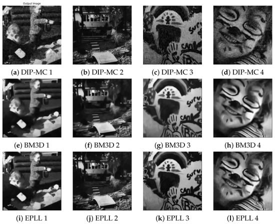 In Figure 14, the first and third columns show outputs generated by DIP-MC, while the second and fourth columns present the outcomes obtained by using DIP-TV. This side-by-side comparison highlights the differences in performance between the two methods, particularly in terms of piecewise smoothness and noise reduction. The visual results demonstrate that DIP-MC achieved superior restoration quality, as evidenced by its ability to preserve finer details and enhance structural clarity compared to DIP-TV. This is consistent with the numerical enhancements noted in Table 4, where DIP-MC consistently exceeds DIP-TV in both PSNR and SSIM evaluations.