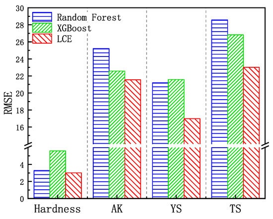 Figure 4 is a comparison of the mean absolute error of the LCE algorithm with that of the random forest and XGBoost in prediction. The results show that the LCE algorithm performs best among all the compared algorithms, and its MAE value is significantly lower than that of the other two algorithms, which verifies the superiority of the LCE algorithm in dealing with the problem of predicting the mechanical properties of medium and thick slabs. As shown in Figure 5, the RMSE values of the LCE model are significantly lower than those of Random Forest and XGBoost. Considering that RMSE penalizes larger errors more heavily due to the square term, this result indicates that the LCE model not only achieves higher overall prediction accuracy but also exhibits better robustness by reducing large deviation cases. Figure 6 is a comparison of the LCE algorithm with the other two algorithms in terms of prediction accuracy. As can be seen from the figure, the LCE algorithm can provide more accurate prediction results.