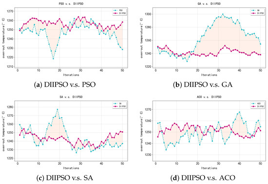 Comparison of DIIPSO with four classical optimization algorithms: (a) PSO, (b) GA, (c) SA, and (d) ACO.