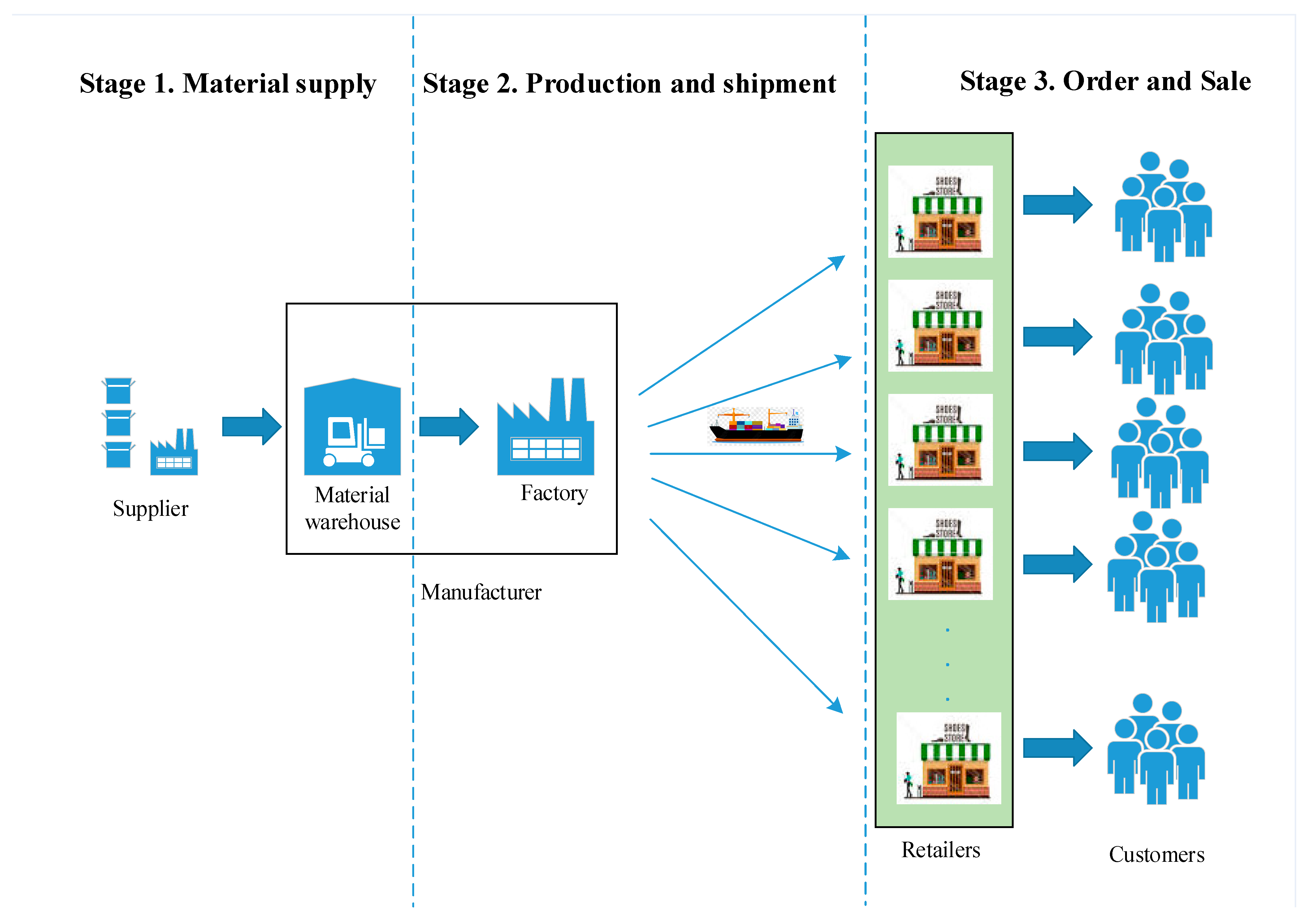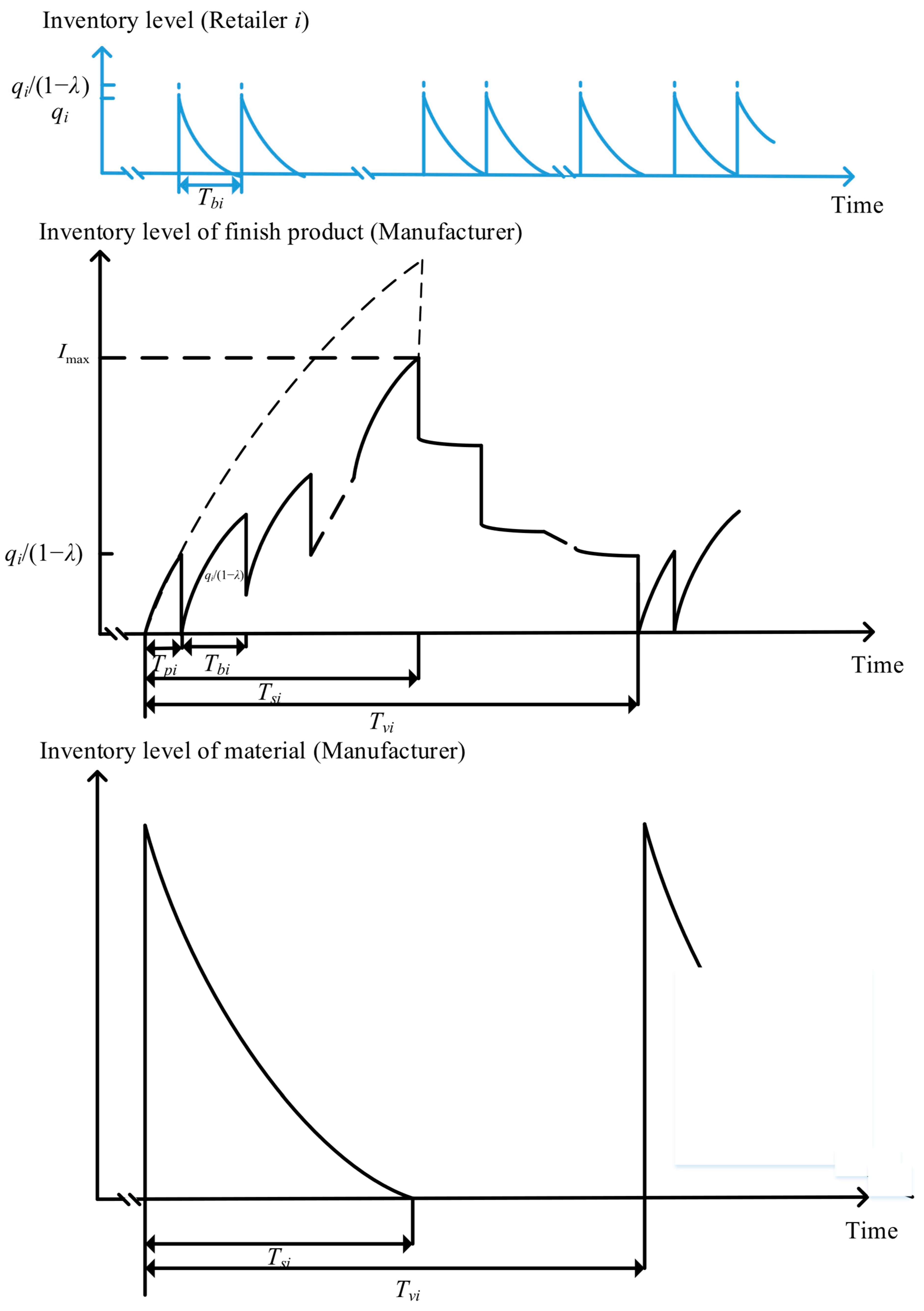 - This study assumes that retailer i places an order of each time, and requires the manufacturer to make deliveries. Given the presence of defective products in the manufacturer’s finished goods with a proportion of , it will ship units to the retailer i during each shipment to ensure that non-defective products are inspected.