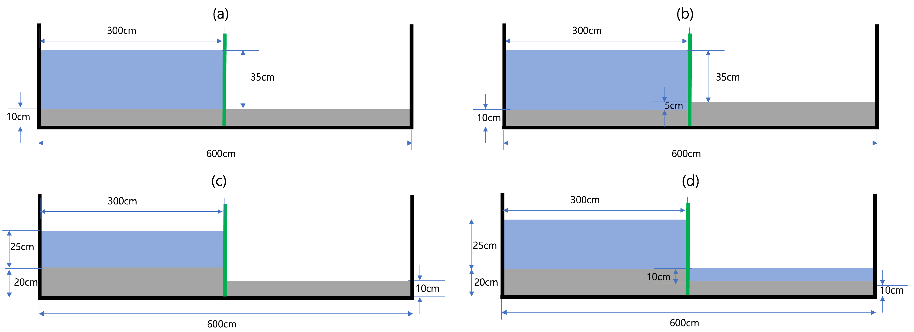 The computational domain is defined as a two-dimensional rectangular region (), partitioned by a gate at . Both the upstream and downstream regions are initialized with a mobile sediment bed, serving as a dynamic boundary condition. The initial parameters, specifically the water column height and sediment layer thickness, are varied according to the specific case configurations.
