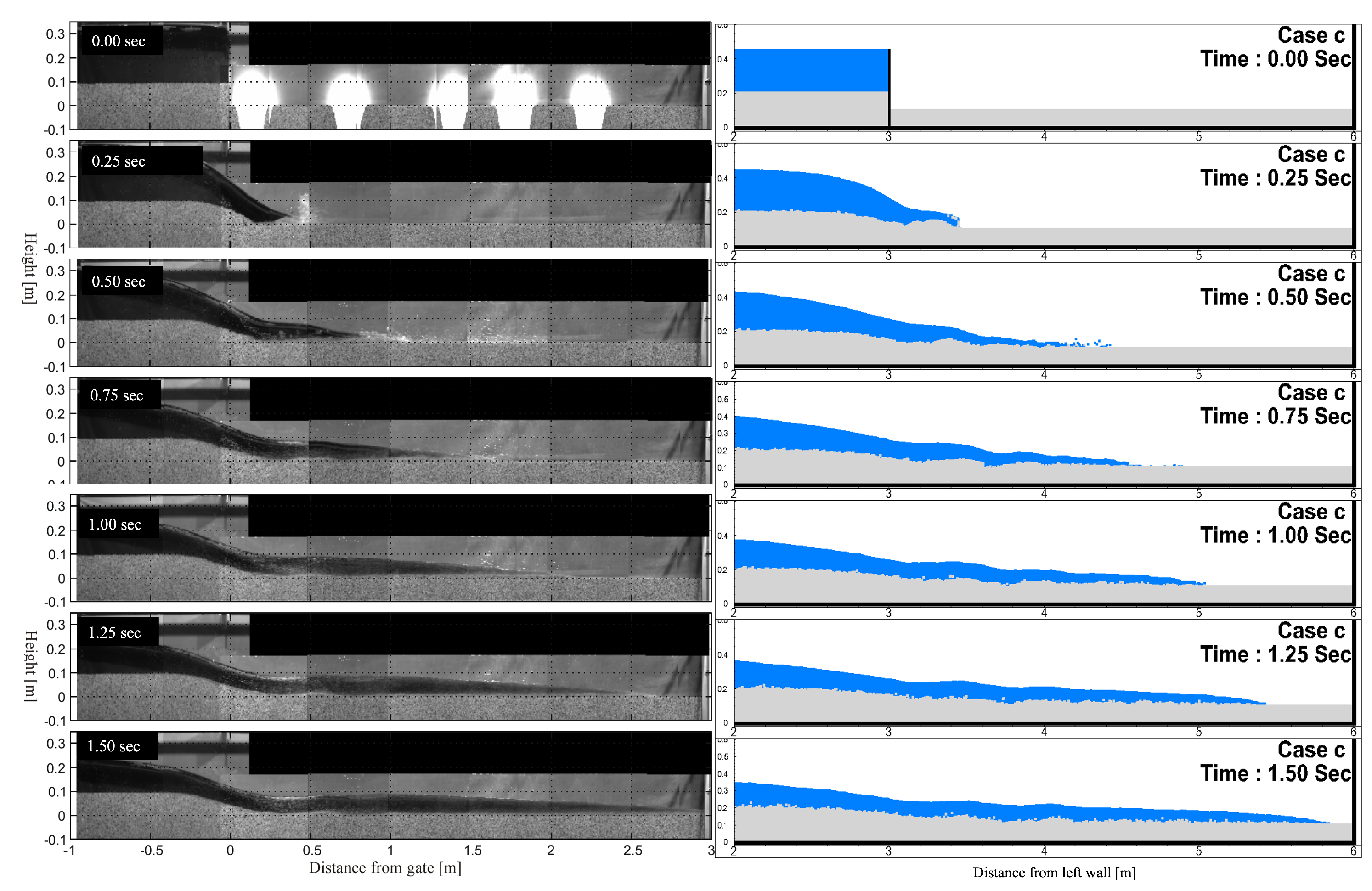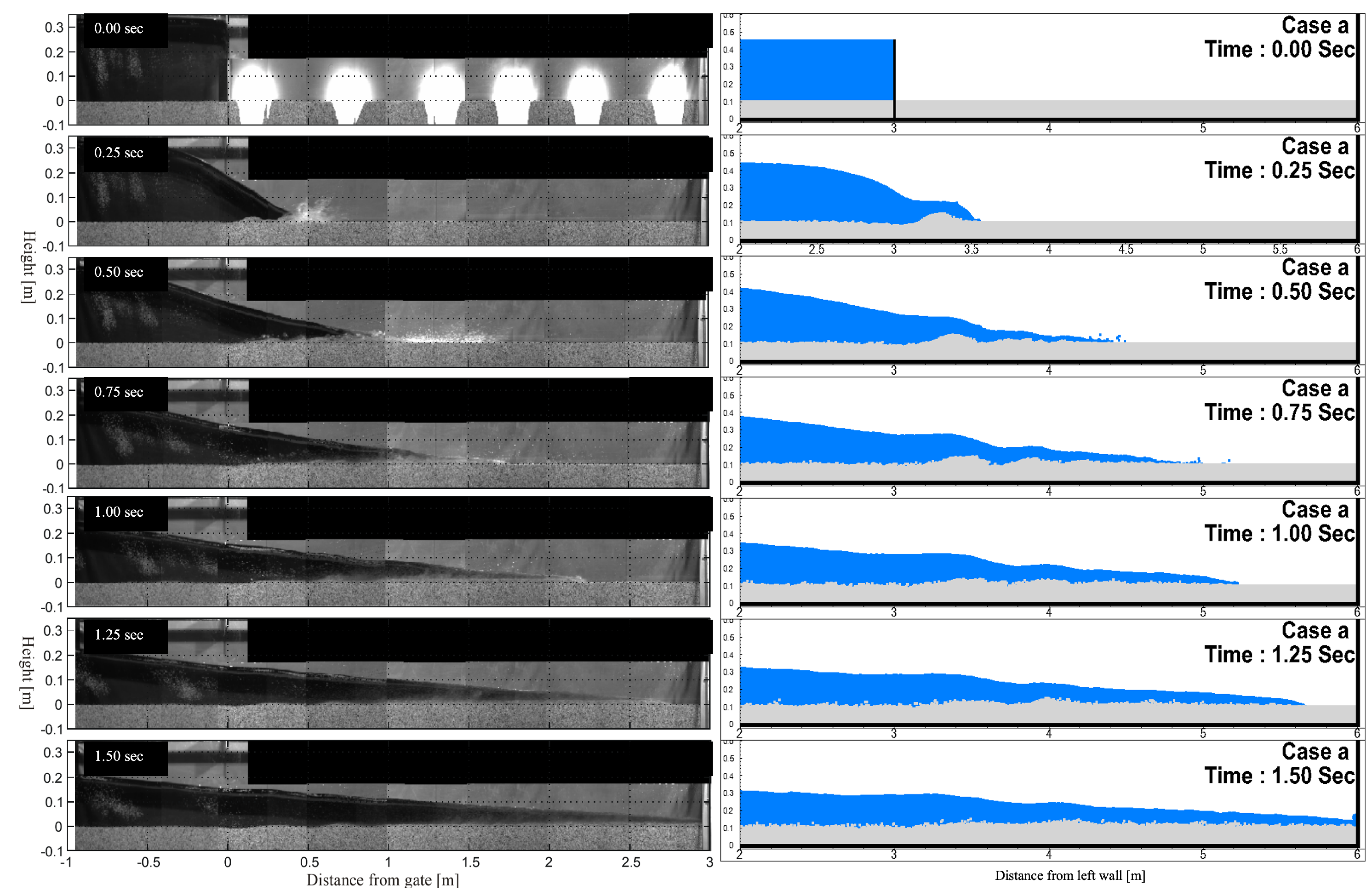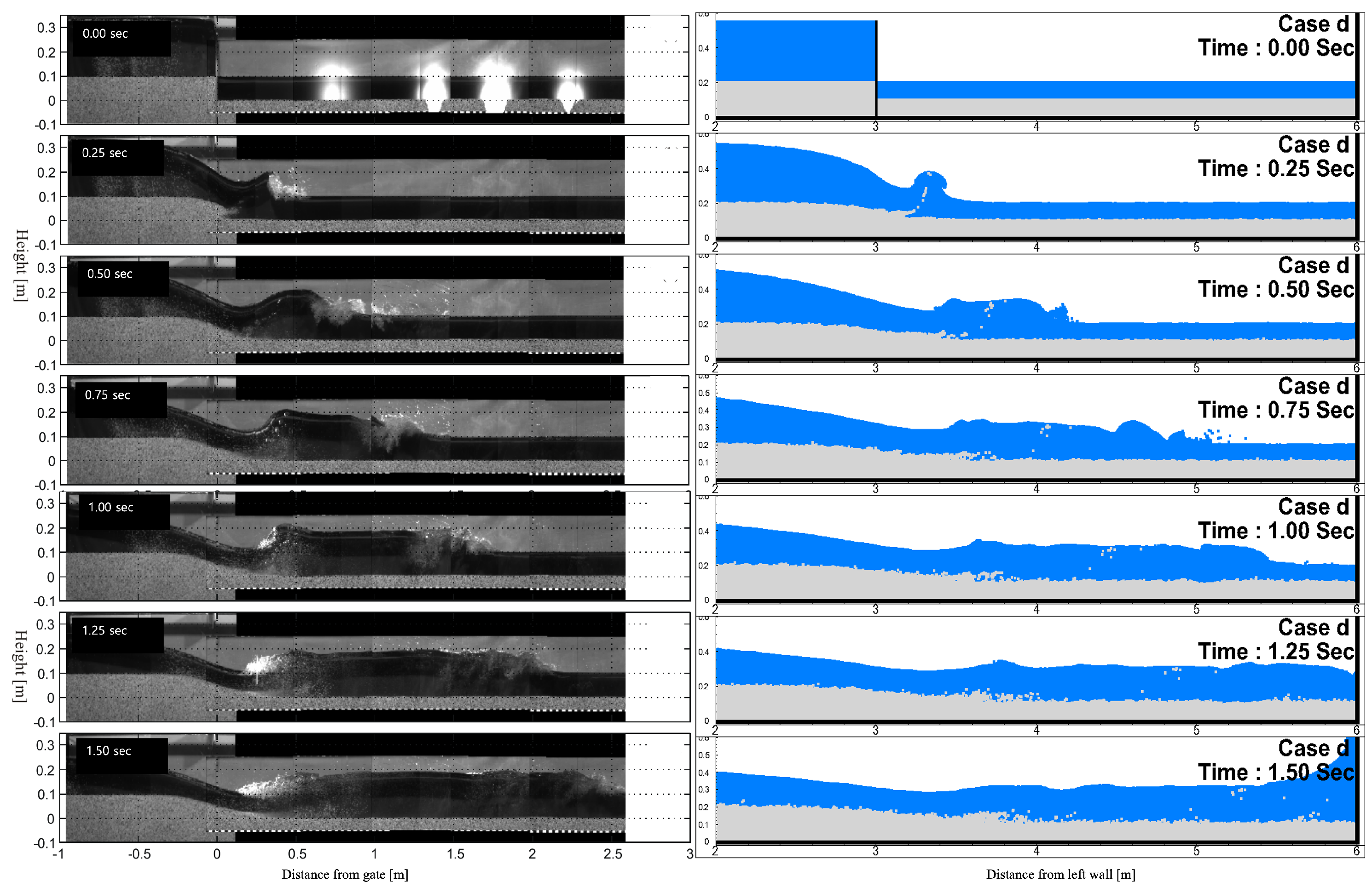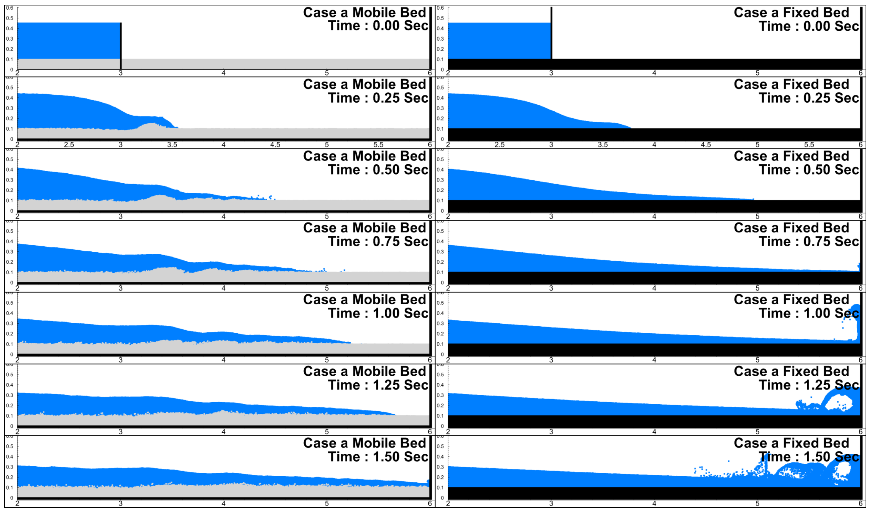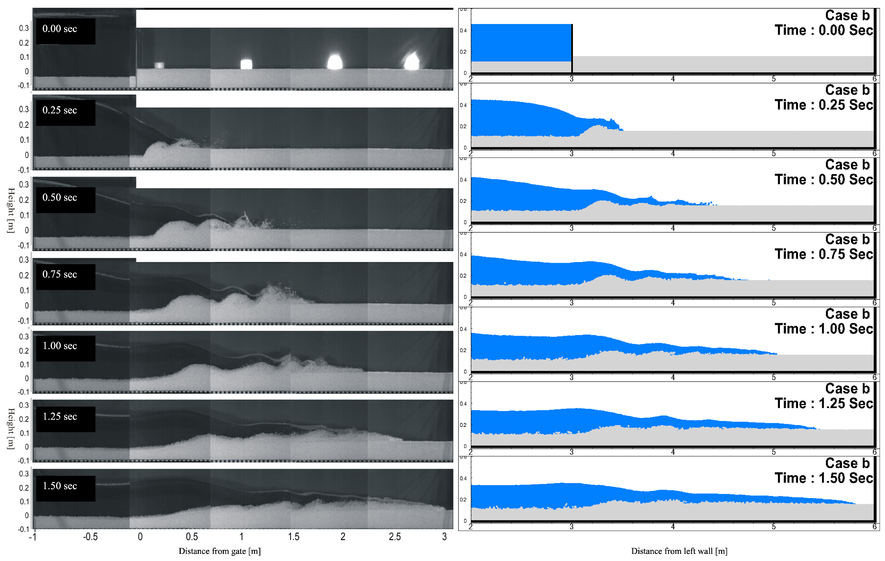 Figure 3 presents a comparison of snapshots between experiment and numerical simulation over a horizontal flat bed, with 0.35 m of water in the upstream reservoir. For the simulation model, total 1,210,000 particles, which includes 51,000 water particles, 70,000 solid particles and dummy and wall particles, were used. The referenced experiment was carried out from [