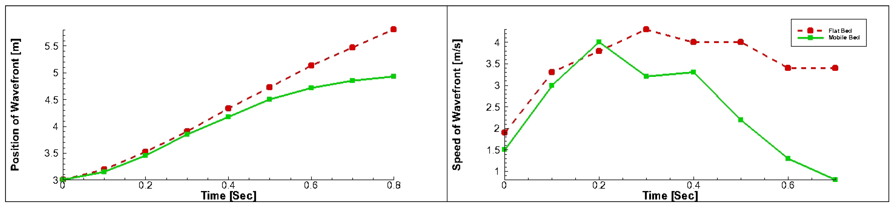 Figure 5. The figure plots the position and velocity of the wave head over time for both bed conditions. As shown in