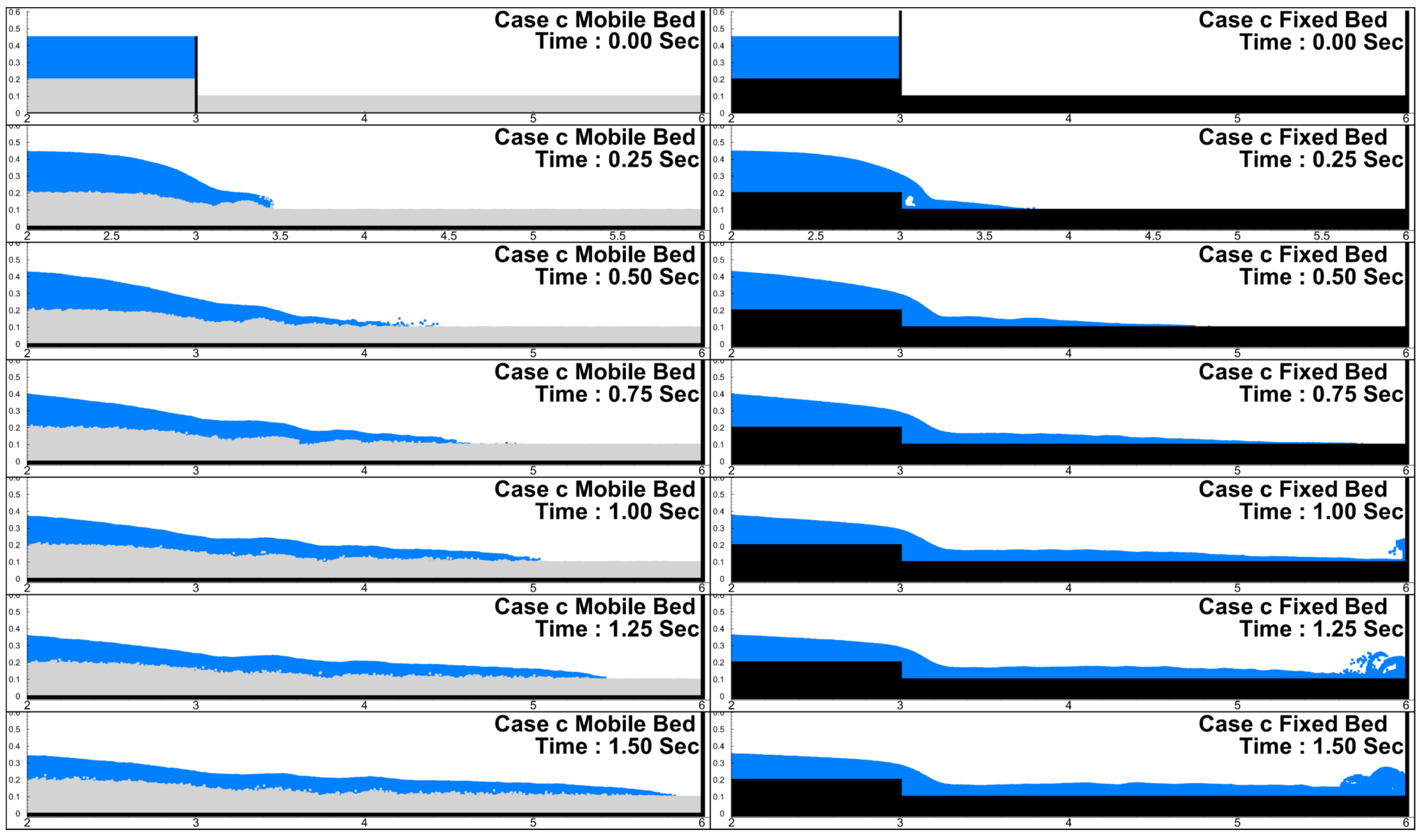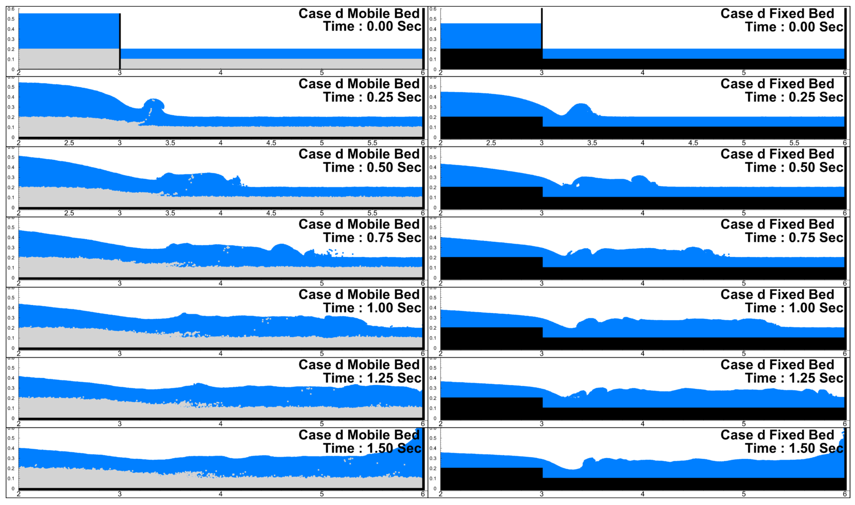 Wave Propagation Celerity: Comparisons between fixed and mobile bed conditions revealed a significant reduction in wave celerity when sediment was allowed to move. For instance, in Case a, the wave front velocity decreased markedly after 0.2 s under mobile bed conditions. Similar damping behavior was observed in Case d. These results confirm that sediment mobility plays a critical role in energy attenuation during dam-break events.
