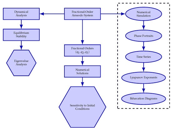 The Figure 1 depicts the study of fractional-order Arneodo systems using the Grünwald–Letnikov scheme. In the left branch, dynamical analysis is performed with the stability of equilibria together with the evaluation of the eigenvalues; the middle one shows the main effects of fractional orders on numerical solutions and sensitivity to initial conditions; finally, the right part presents some numerical simulations: phase portraits, time series, Lyapunov exponents, and bifurcation diagrams. This structure, therefore, shows how fractional calculus combined with numerical methods effectively captures stability, sensitivity, and complex dynamical behaviors.