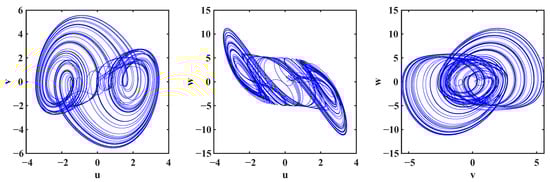 The phase–space projections shown in Figure 2, Figure 3 and Figure 4 outline that changing the fractional orders q alters both the geometrical structure and the complexity of the system’s trajectories. For , the attractor has well-defined lobes with smooth rotating motion and reflects strongly chaotic but organized geometry. When q is reduced to , the trajectories of the system become a little more compressed and less symmetric, signaling that the intensity of chaos decreases because lower fractional orders have stronger memory effects. On the other hand, in the mixed order case , one obtains an attractor that is distinctly more irregular, underlined by much longer loops and larger dispersion, once again pointing to the sensitive dependence of dynamics on the fractional orders. Finally, all these results confirm that small fluctuations in q substantially alter the attractor geometry and modify the degree of chaotic behavior, confirming that the fractional order is one of the most important determinants of the overall system dynamics.