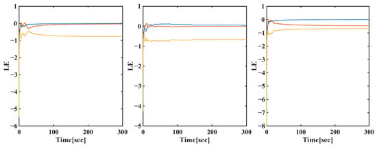 In order to quantify the rich dynamics apparent in the phase portraits, the finite-time LEs were calculated, and the time evolution is shown in Figure 8. The plots indicate the convergence as the simulation time approaches . In those cases for which chaos appears, the largest Lyapunov exponent () converges to a value that is strictly positive, yielding the unquestionable signature of sensitivity to initial conditions and chaotic divergence. On the other hand, the sum of the LEs is negative (), which confirms the dissipative nature of the system, with its trajectories flowing on a bounded strange attractor within the phase space.