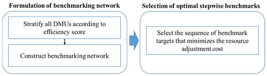 The framework of the proposed method consists of two parts, as illustrated in Figure 1: formulation of a benchmarking network, and selection of the optimal stepwise benchmarking targets. Here, the benchmarking targets are represented by the benchmarking ports. The procedure begins by stratifying all DMUs (ports) into several layers based on their efficiency scores. Once the DMUs are stratified, a benchmarking network is constructed, consisting of all possible sequences of intermediate benchmark targets (IBTs), which can be used as an inefficient DMU aiming to improve its efficiency score toward a final benchmarking target (FBT). Finally, the optimal stepwise benchmarking targets and path are determined by selecting the sequence of IBTs that minimizes the resources (inputs and outputs) adjustment cost (i.e., improvement amount) between ports.