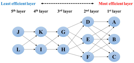 When the DMU stratification method is applied to the data in Table 2, the DMUs are grouped into five efficiency layers as follows: (most efficient, 1st layer) = {A, B}, = {E, F}, = {C, D}, = {G, H}, = {K}, = {I}, and (least efficient, 7th layer) = {J, L}. In this hierarchy, DMUs in the lowest efficiency layer (e.g.,) can identify IBTs by sequentially referencing DMUs in the upper layers (, , , , , ). Since each layer may contain multiple DMUs, various stratified benchmarking paths can be formed for a given evaluated DMU. For instance, if DMU L is selected as the evaluated DMU, the benchmarking network can visualize as directed network, as shown in Figure 2, where each directed edge represents a feasible step to a more efficient layer. This full-sized benchmarking network includes all of the 16 possible alternative benchmarking target sequences from the evaluated DMU (L) to the UBTs (A or B).