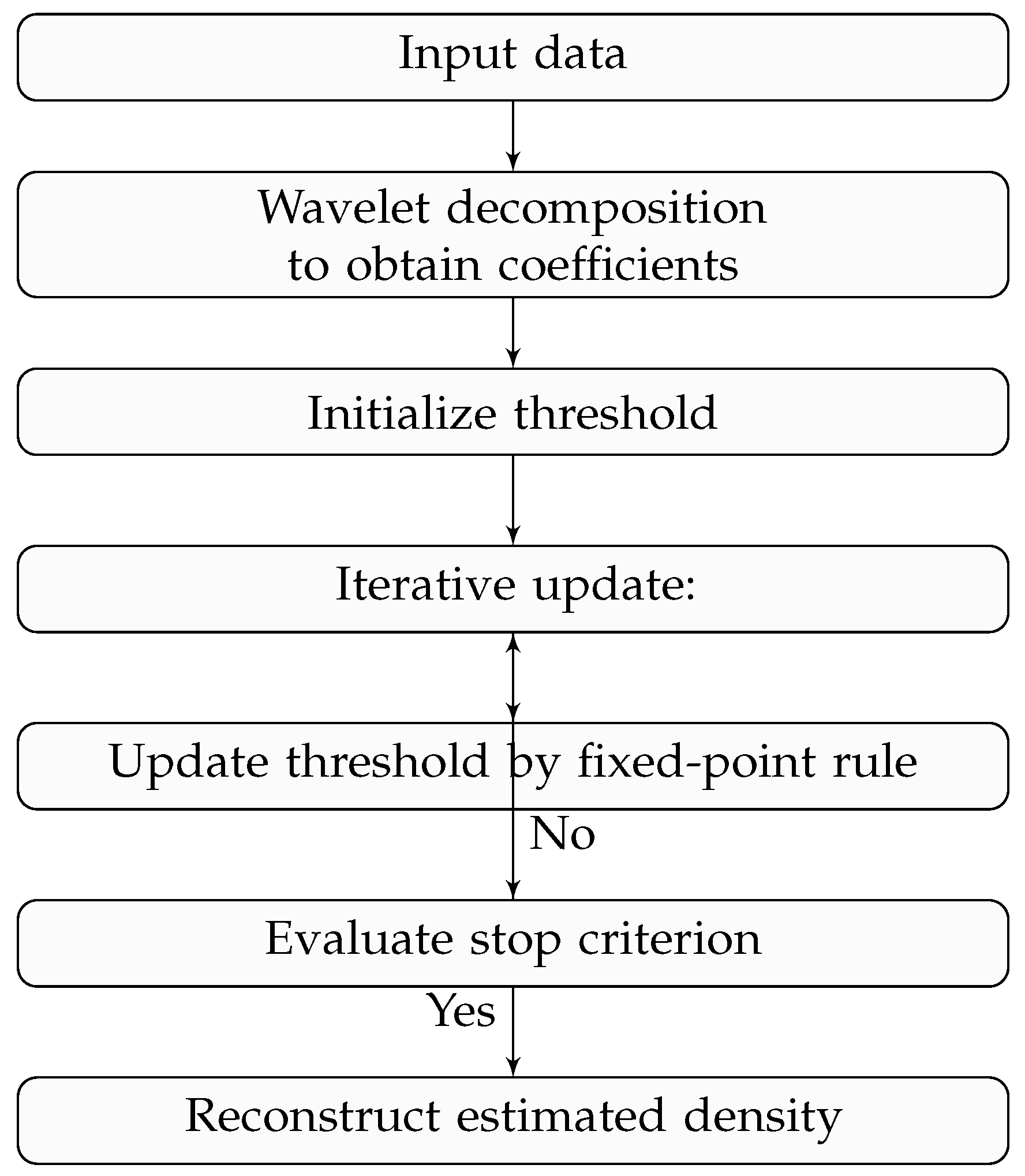 Figure 1 presents the algorithmic flow of the fixed-point iterative wavelet thresholding procedure for density estimation. The process begins with the wavelet decomposition of the empirical density, followed by iterative threshold updates until convergence is achieved, resulting in a smooth and adaptive estimate of the density function.