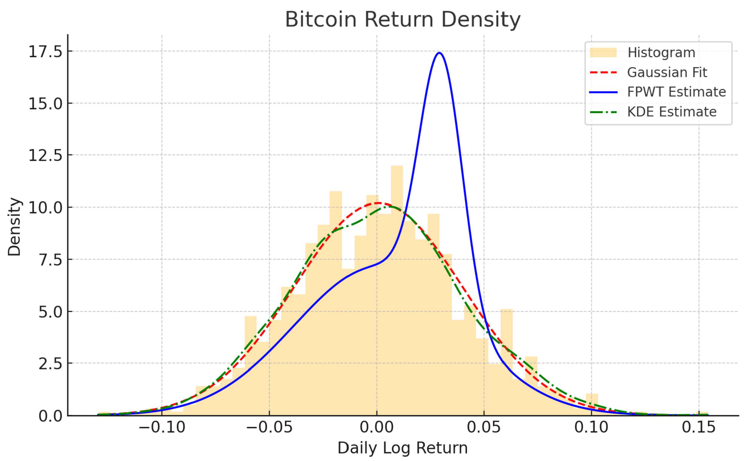 Figure 2 compares several density estimation methods for daily log returns of Bitcoin.