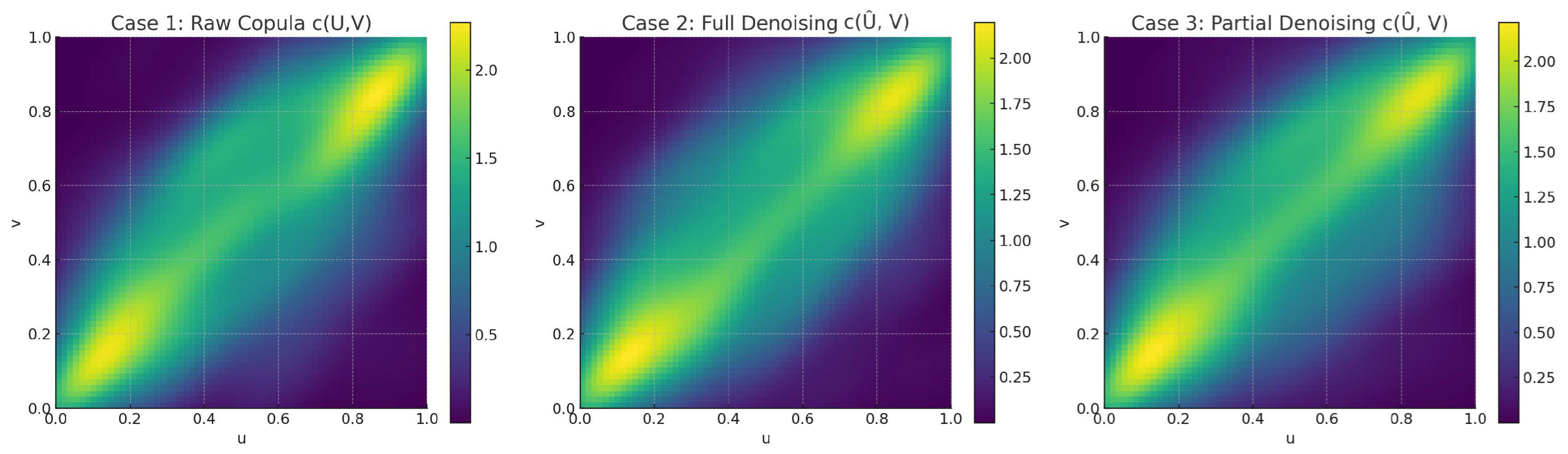 Figure 4 confirm that applying wavelet thresholding, even partially, improves the accuracy and interpretability of copula estimates, especially when data are contaminated with noise or exhibit nonlinear dependencies.