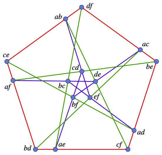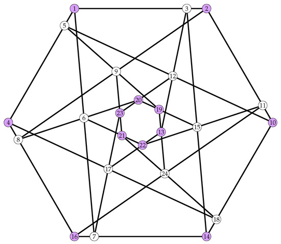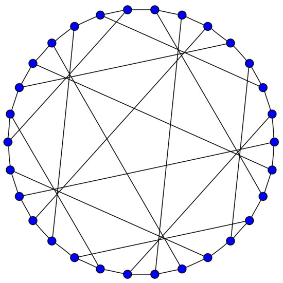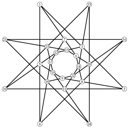 The Levi graph of the Cremona–Richmond configuration is a graph on 30 vertices, known as Tutte’s 8-cage. It is shown in Figure 3 (picture credit: Wikipedia). The graph was explored by Tutte [22] and independently by Coxeter [23]. The automorphism group of the graph is the full automorphism group of , of order 1440. A cage is a regular graph with the least number of vertices for a given girth (length of the shortest cycle). The 8-cage above is the smallest 3-regular graph with girth 8.