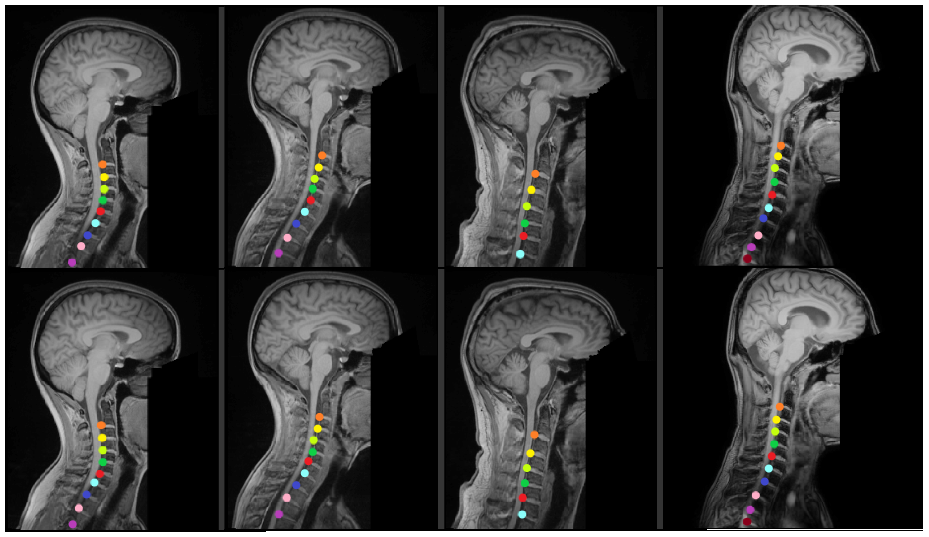 - Cohen-Adad, J.; Alonso-Ortiz, E.; Abramovic, M.; Arneitz, C.; Atcheson, N.; Barlow, L.; Barry, R.L.; Barth, M.; Battiston, M.; Büchel, C.; et al. Open-access quantitative MRI data of the spinal cord and reproducibility across participants, sites and manufacturers. Sci. Data 2021, 8, 219. [Google Scholar] [CrossRef] [PubMed]