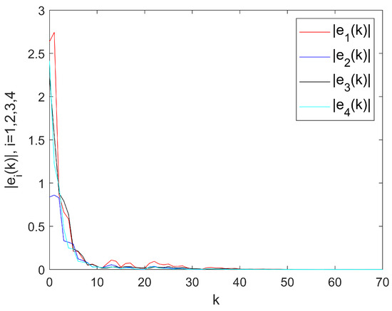 where , and and are selected such that Equation (25) satisfies condition (24). Therefore, based on the selected parameters, the upper bound of the error of the quasi-consensus of system (1) is .