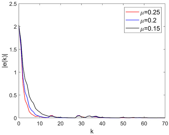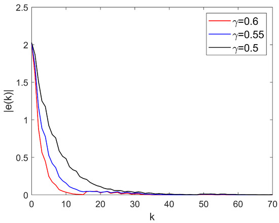 In addition, to verify the feasibility of the range and robustness of , we select with fixed for simulation. The corresponding results are presented in Figure 6. As observed from Figure 6, for a given , the convergence rate slows down with the decrease in , which reveals a positive correlation between the control gain scalar and the convergence rate . Furthermore, even though the reduction in reaches , the degradation of the convergence rate is maintained within ( for , respectively). This result further verifies the strong parameter robustness of the proposed control strategy.