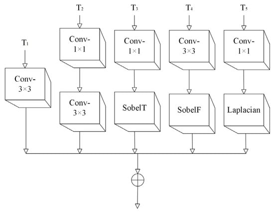 The ECB module [31], as shown in Figure 3, is an efficient multi-branch parallel convolution structure designed to extract rich local information and edge gradients from input features. The ECB module employs a multi-branch parallel architecture inspired by multi-scale feature extraction techniques used in signal processing and computer vision. It utilizes standard convolutions to extract basic textures, complemented by Sobel and Laplacian operators that specifically capture edge and second-order structural features, respectively. The outputs of each branch are fused to generate highly discriminative features that preserve global semantics while enhancing local details. The ECB module contains five parallel branches, denoted as to , each performing different convolution or filtering operations. The output of the ECB layer can be expressed by the following formula: