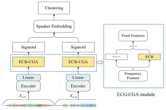 Based on the idea of texture feature fusion, the ECB-CGA module is integrated into the EEND-VC framework to construct an improved end-to-end speaker diarization (EEND-ECB-CGA) system. The overall structure of the EEND-ECB-CGA model is depicted in Figure 5.