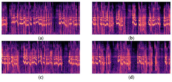 Spectrograms of noisy mixed speaker audio. (a–d) represent different noisy mixtures, respectively. (a) noisy mixture #1; (b) noisy mixture #2; (c) noisy mixture #3; (d) noisy mixture #4.