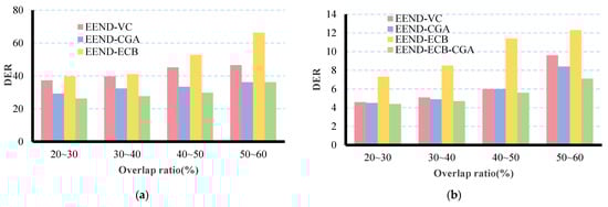 These two variants, along with the original EEND-VC and the proposed EEND-ECB-CGA, were compared using both the LibriSpeech and LibriSpeech_mini datasets. The results of the ablation study are shown in Figure 8a,b.