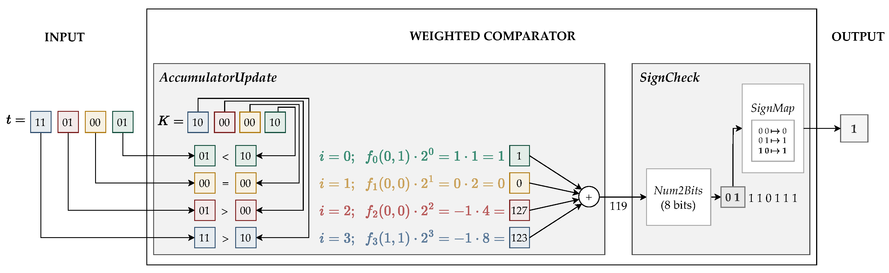 K by computing a weighted sum whose sign indicates the comparison result. The accumulator is built by scanning the bits of