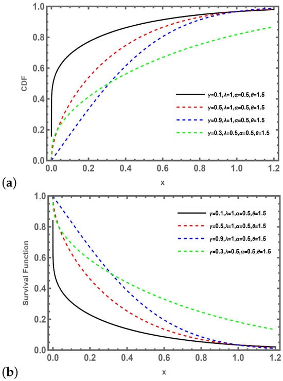(a) The CDFs of NMMWD with different paremeter values, (b) the survival functions of NMMWD with different parameter values.