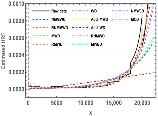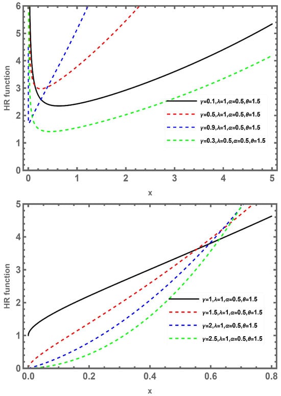 Using different parameter values, as described in Lemma 3, the behavior of HRF of the NMMWD can have increasing and bathtub shapes, as illustrated in Figure 3.