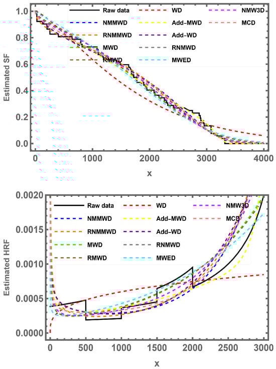 - Three sets of initial values for the parameters , , , and are assigned to the NMMWD. Two sets, and , correspond to bathtub-shaped hazard functions, and one set, , corresponds to an increasing hazard function.