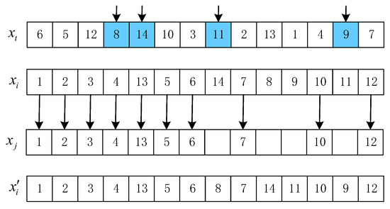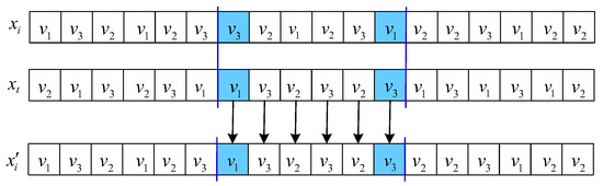 OBX acts on the scheduling string. For solutions and , randomly select G genes from , delete them from , and produce a partial solution . Finally, is generated by adding the chosen genes into as a sequence in , where G is set to by experiments. Figure 3 describes the process of OBX. Two-point crossover is applied to the speed string. For , stochastically select two positions l and h, . The speeds between l and h are replaced by the same positions of , as shown in Figure 4.