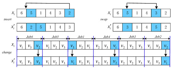 Neighborhood structures . The colors represent randomly selected jobs or processing speeds. The arrows in the insert, swap, and change operators indicate job insertion, position swapping, and replacement operations, respectively.