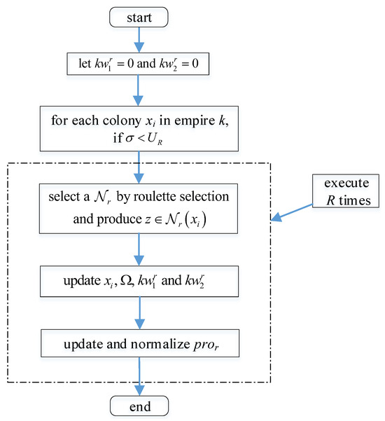 To ensure the diversity of the population, the initial with N colonies is randomly produced. Initial empires are constructed after is obtained. For a colony , its normalized cost is calculated. Then, the colonies with the greatest values are selected as imperialists, and the remaining ones are assigned as colonies. Next, and are calculated for imperialist , and colonies are randomly allocated to imperialist . is determined as in Equation (14).
