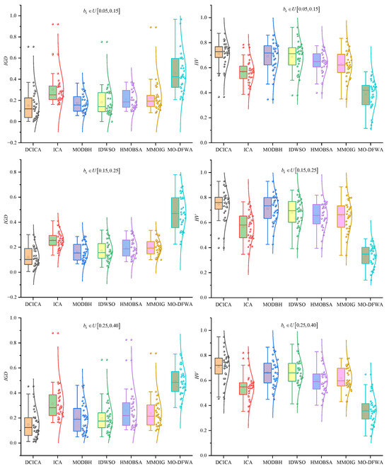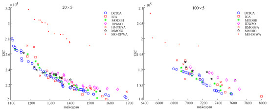 Figure 9 and Figure 10 are the box plots of metrics and non-dominated solutions produced by all algorithms. As shown in Figure 9, for the metric , the average values of DCICA are lower (higher) than those of ICA, MODBH, IDWSO, HMOBSA, MMOIG, and MO-DFWA. Hence, it indicates that DCICA is superior to ICA, MODBH, IDWSO, HMOBSA, MMOIG, and MO-DFWA. In Figure 10, it can be observed that the convergence of DCICA is better than that of other methods, and the solutions obtained by DCICA are also uniformly distributed in the search space. Therefore, the non-dominated solution distributions also illustrate that DCICA is superior to ICA, MODBH, IDWSO, HMOBSA, MMOIG, and MO-DFWA in solving EPFSP-DEM.