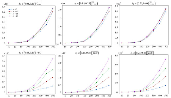 To observe the results more intuitively and analyze the influence of the deterioration effect for EPFSP-DEM, the results obtained by DCICA are listed in Table 16, Table 17 and Table 18 and presented in Figure 11, where and are the average value of and of non-dominated solutions produced by DCICA for each instance. Since EPFSP-DEM is a multi-objective optimization problem and many non-dominated solutions are commonly obtained, adopting and can better measure variations in and that are caused by the deterioration effect of machines.