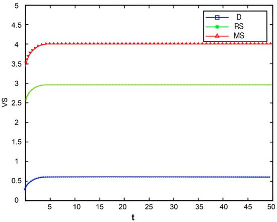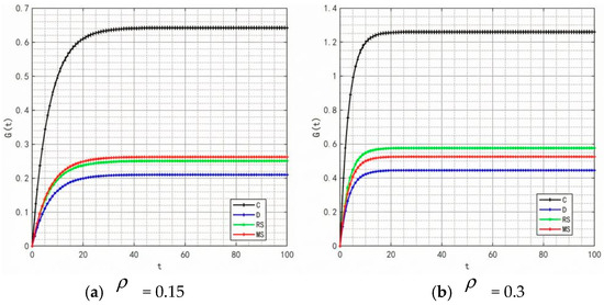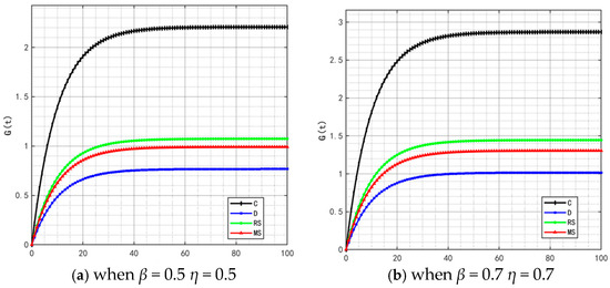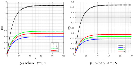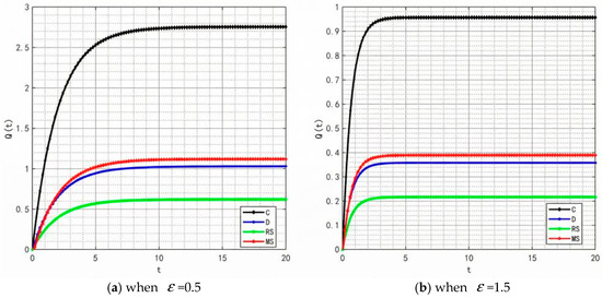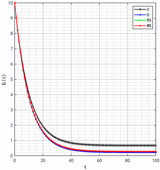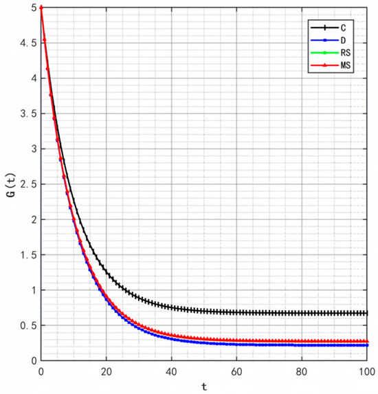 In Equation (2), denotes the goodwill of prefabricated food at time t; represents the coefficient reflecting the effect of product quality on goodwill; denotes the retailer’s traceability information-sharing behavior; indicates the coefficient representing the effect of the retailer’s traceability information-sharing behavior on goodwill; represents the decay coefficient of goodwill or the effect of consumer forgetfulness on goodwill [35]; and denotes the initial level of goodwill.