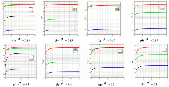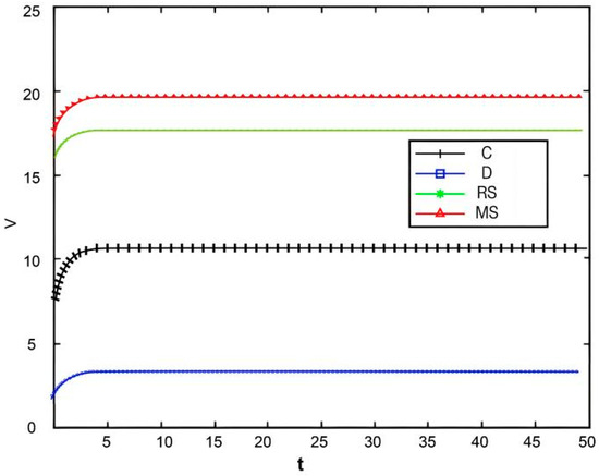 In Equations (3) and (4), represents the initial market demand; ξ denotes the consumer preference coefficient for online channels; reflects the degree to which product quality influences the demand for traceable food; represents the effect of goodwill on the demand for traceable food; and , , and denote the unit marginal revenues of the manufacturer’s online and offline channels and of the retailer, respectively. In addition, the manufacturer and the retailer adopt the same discount rate for evaluation.