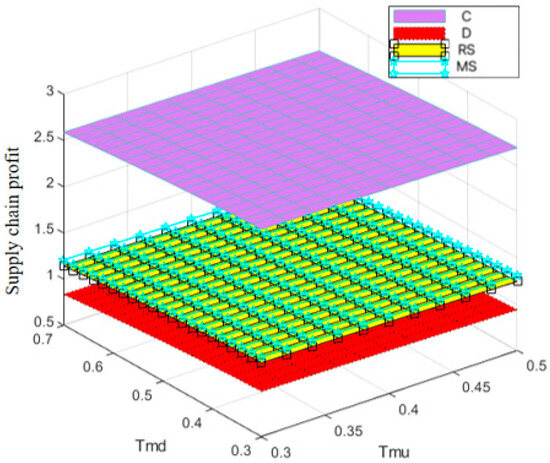Evidently, Equations (A26) and (A27) are convex functions with respect to Tmu3 and Tmd3. Maximizing them under the first-order conditions yields the following: